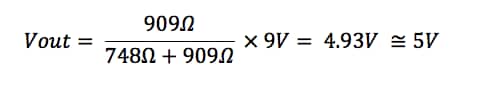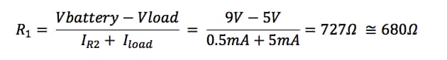 Let’s talk a moment about how to decide the resistor values you will need for your voltage divider. To do so, you must take into account the load that will be connected to the output of the voltage divider. Let’s assume our load is 1KΩ and requires 5V at 5mA. We now apply the “10% Rule” so that the “bleeder current” through R2 is 10% of the current that we want to follow though the load. In this case: