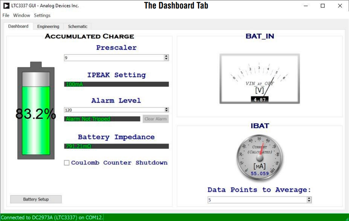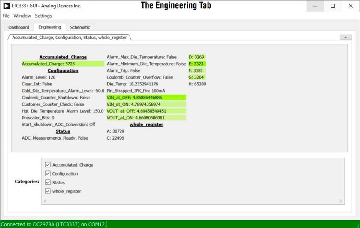 The QuikEval software provides a GUI that enables users to configure the target device and view its status. The GUI is divided into a Dashboard tab, an Engineering tab, and a Schematic tab. The Dashboard tab shows a graphical representation of the LTC3337’s core functionality. The Engineering tab shows all registers and is intended to be used for lower-level development and debugging purposes. The Schematic tab displays the schematic for reference.
