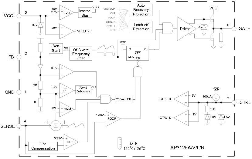 Diodes Inc. AP3125 Green Mode PWM Controllers are current mode PWM controllers which are optimized for high performance, low standby power and cost effective offline flyback converters. The PWM switching frequency at normal operation is internally fixed (about 65kHz). In middle load, the IC will enter green mode to improve system efficiency with the help of frequency foldback. A minimum switching frequency (about 20kHz) is set to avoid the audible noise. In no load or light load, the IC will enter the burst mode to minimize standby power. Furthermore, the frequency dithering function is built-in to reduce EMI emission. Internal slope compensation allows more stable Peak-Current Mode control over a wide range of input voltage and load conditions. Internal line compensation ensures constant output power limit over entire universal line voltage range.Features