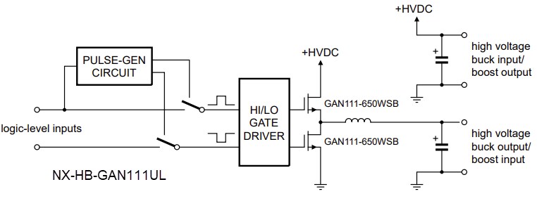 The NX-HB-GAN111UL Evaluation Board provides the elements of a simple buck or boost converter using GAN111-650WSB GaN FET. This board enables the basic study of the switching characteristics and efficiency achievable with 650V GaN FETs. The NX-HB-GAN111UL evaluation board features selection jumpers that allow the use of a single logic input or separate high/low level inputs. The high-voltage input and output can operate at up to 400VDC, with a power output of up to 2kW.