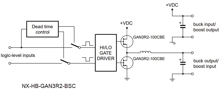 The NX-HB-GAN3R2-BSC Evaluation Board provides the elements of a simple buck or boost converter. This enables the basic study of the switching characteristics and efficiency achievable with 100V E-Mode GaN FETs. This evaluation board features selection jumpers that allow the use of a single logic input or separate high/low level inputs. The voltage input and output can operate at up to 60VDC, with a power output of >350W.